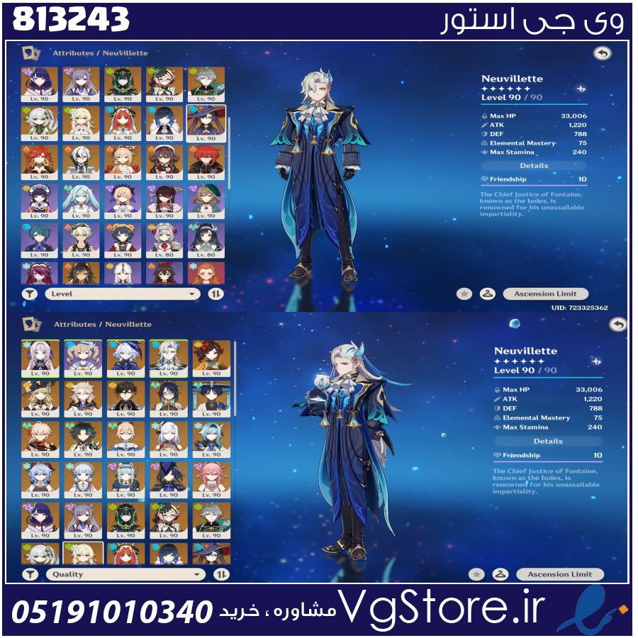 توضیحات بیشتر: Genshin Impact Account – High-End / Whale Account 39× 5-Star Characters 45× 4-Star Characters Notable 5-Star Characters & Constellations: Hu Tao C1 + BiS weapon (Staff of Homa) + Skin Ayaka C1 + Skin Mona C2 Qiqi C2 Keqing C3 Diluc C3 Tighnari C3 Dehya C1 5-Star Weapons Included: Bows Thundering Pulse Skyward Harp Catalysts Lost Prayer to the Sacred Winds Skyward Atlas ×2 Polearms Crimson Moon’s Semblance (Arlecchino’s weapon) Calamity Queller Primordial Jade Winged-Spear Staff of Homa Swords Summit Shaper Claymores Wolf’s Gravestone Skyward Pride ×2 (one R3) 5-Star Characters Included Citlali Furina Neuvillette Chiori Navia Albedo Zhongli Xianyun Wanderer (Scaramouche) Kaedehara Kazuha Xiao Jean Shenhe Eula Ganyu Ayaka Ineffa Clorinde Yae Miko Raiden Shogun Keqing Nefer Emilie Alhaitham Nahida Nilou Yelan Mona Mavuika Arlecchino Yoimiya Hu Tao Diluc