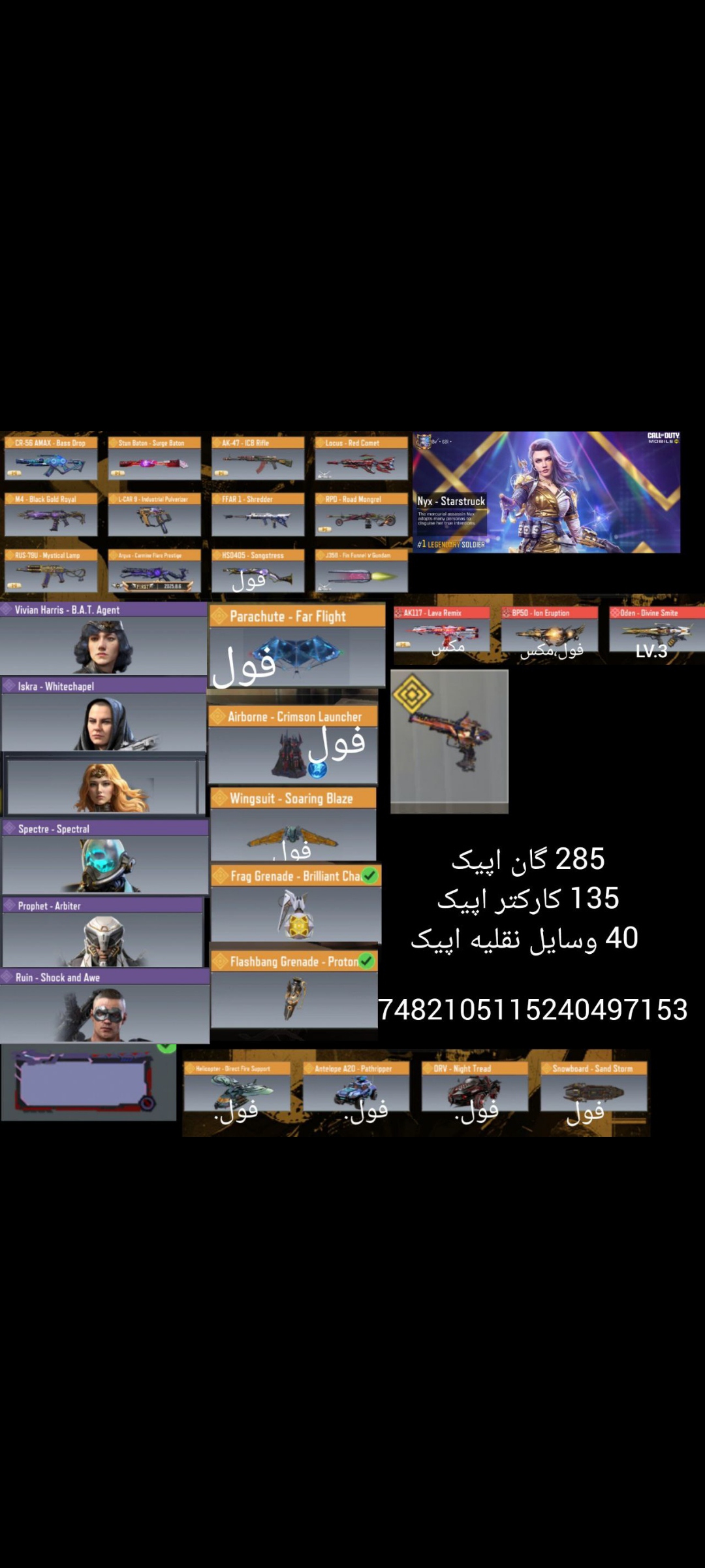 توضیحات: همه چیز توی عکس مشخصه عکس دیگه نذاشتم اکانت خفن و گاد پول لازمم این قیمت میدم فول هاش گادن متیک هاش دوتاش فول یکی لول 3 اینم دوتا بزنید هر سه مکث میشن متیک های خوبی داره لجند هاش هم عالین