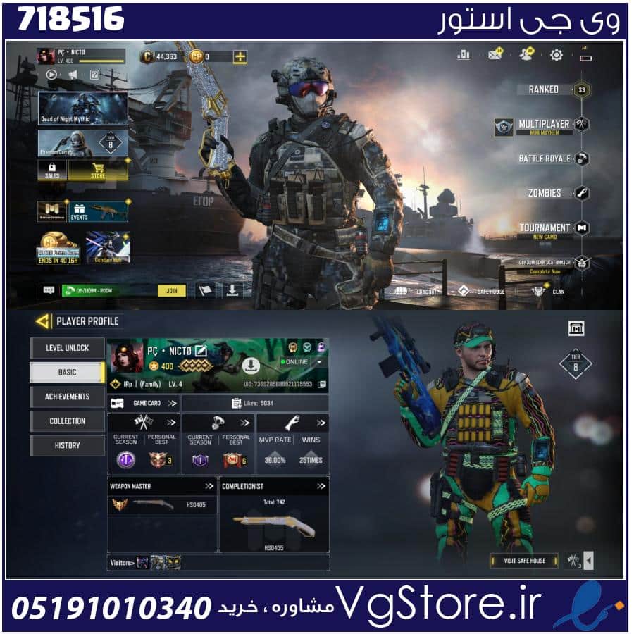 اکانت کالاف دیوتی موبایل لول 400 ریجن هند کد 718516