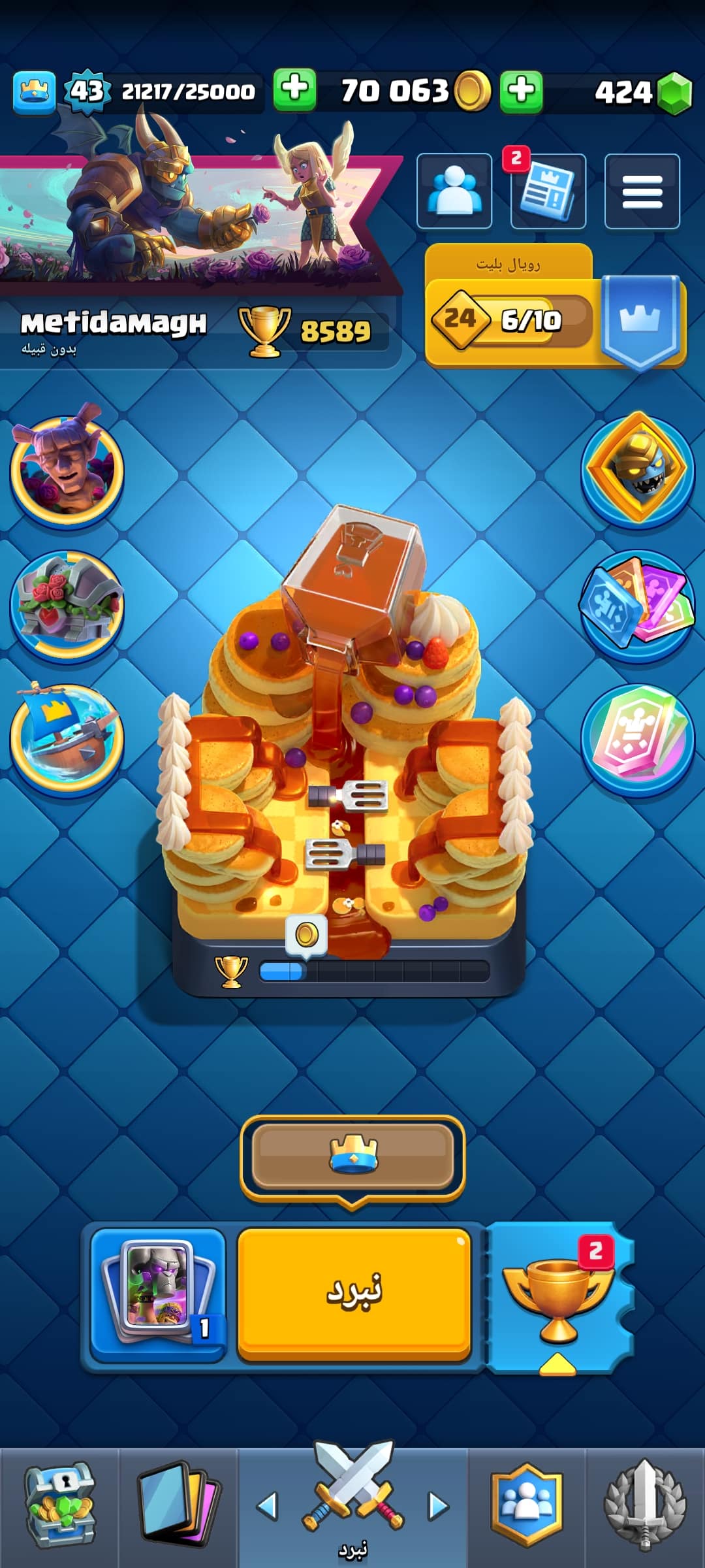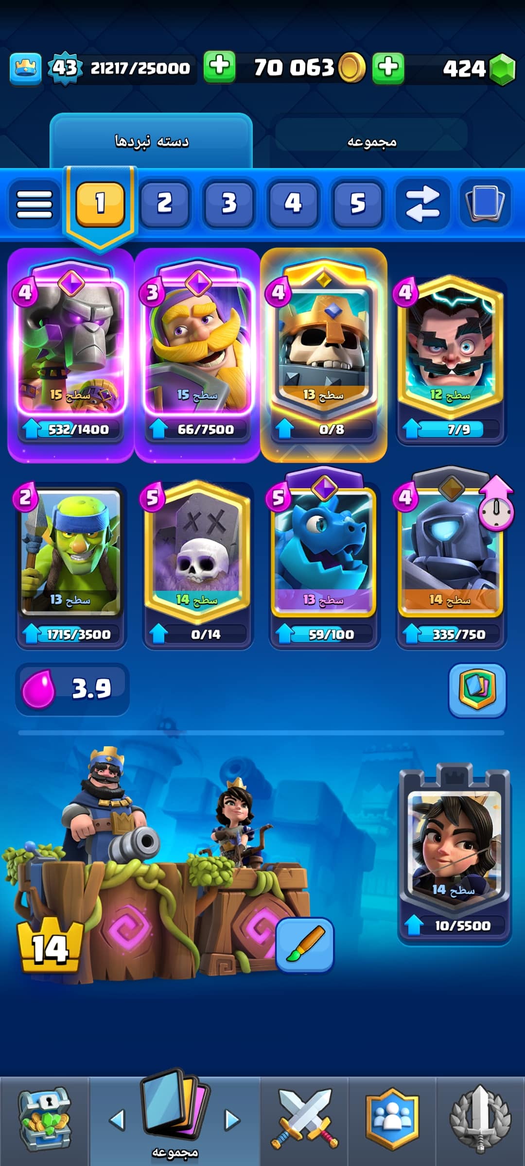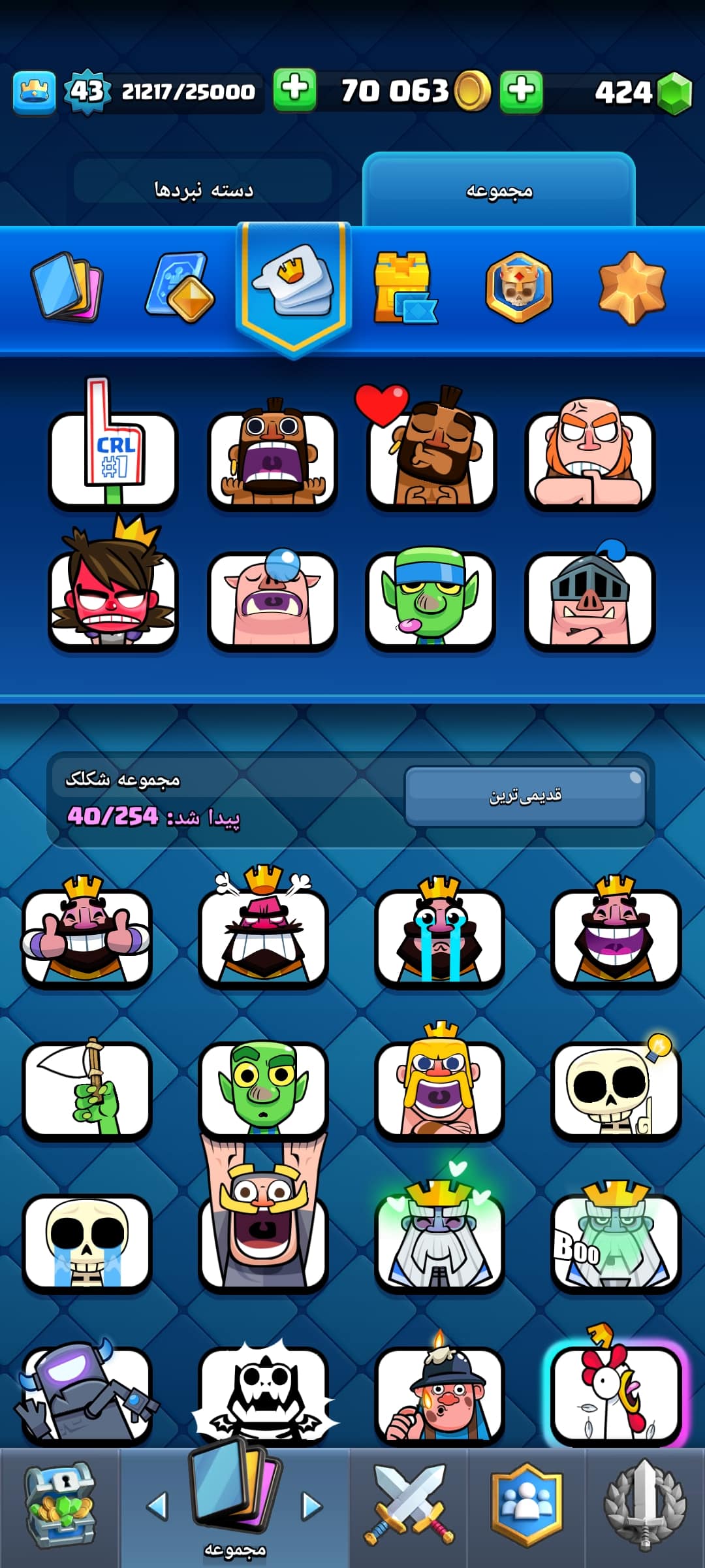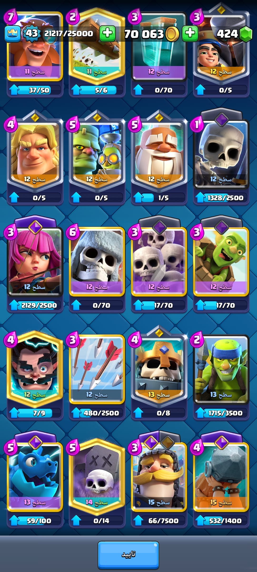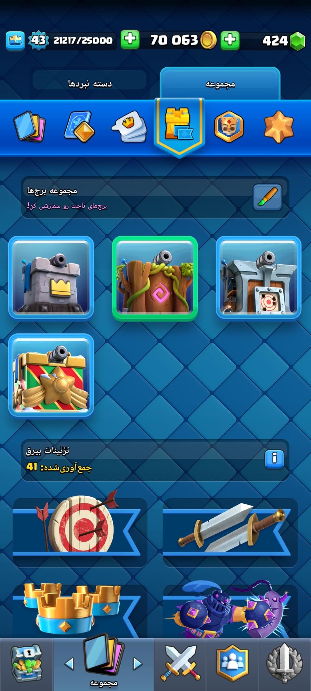 نام اکانت : اکانت دارای 9کارت تکامل 40شکلک,و4جلدبرج،به همراه کلش مبارک خریدار